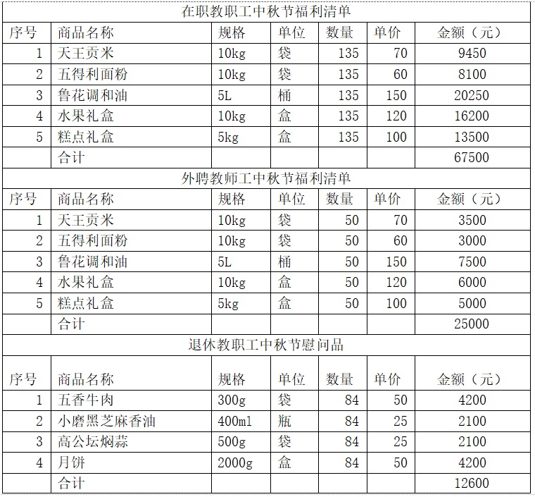 我校中秋发放一批教职工福利物品,现向社会公开询价。有意向者,请在2025年9月28日上午9点之前到我校递交有效资质及报价单,逾期不予受理。现把项目实施需求公示如下: